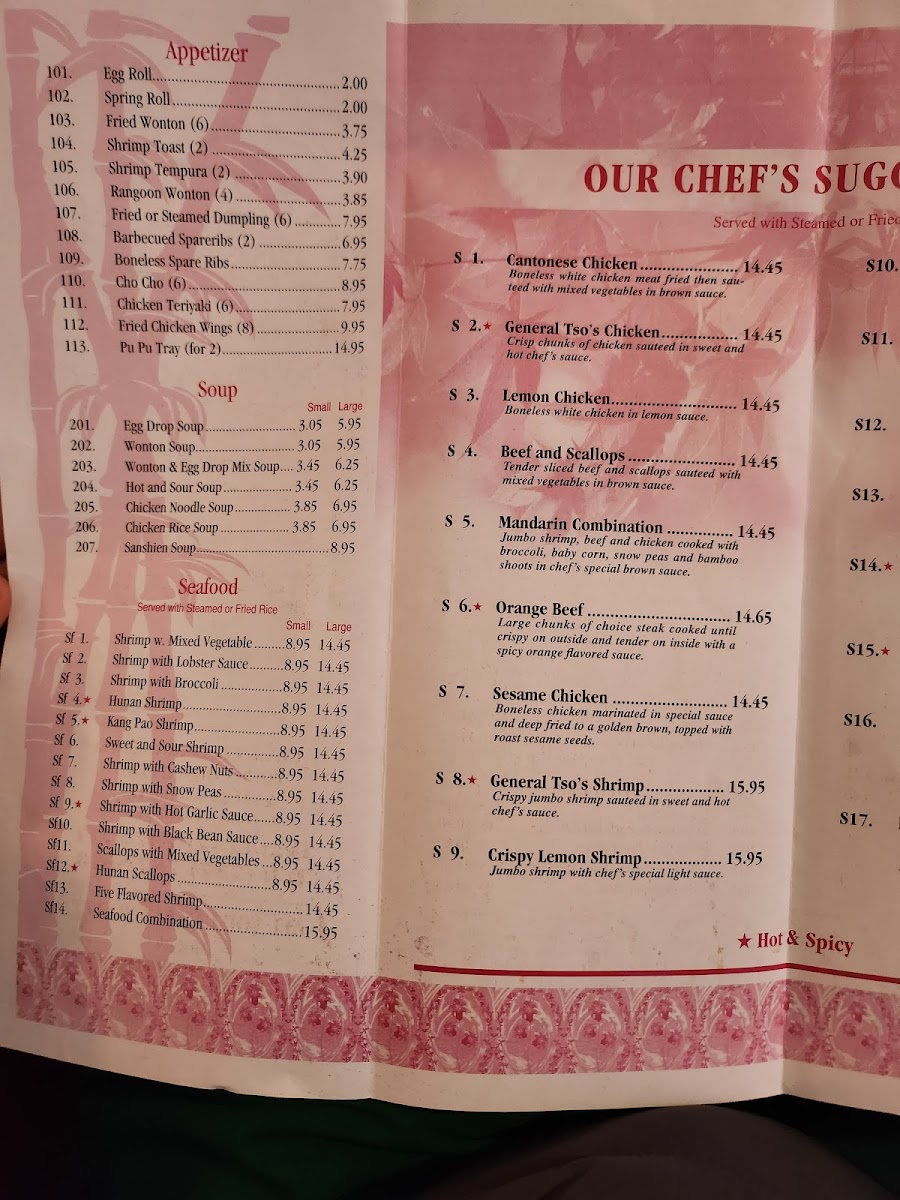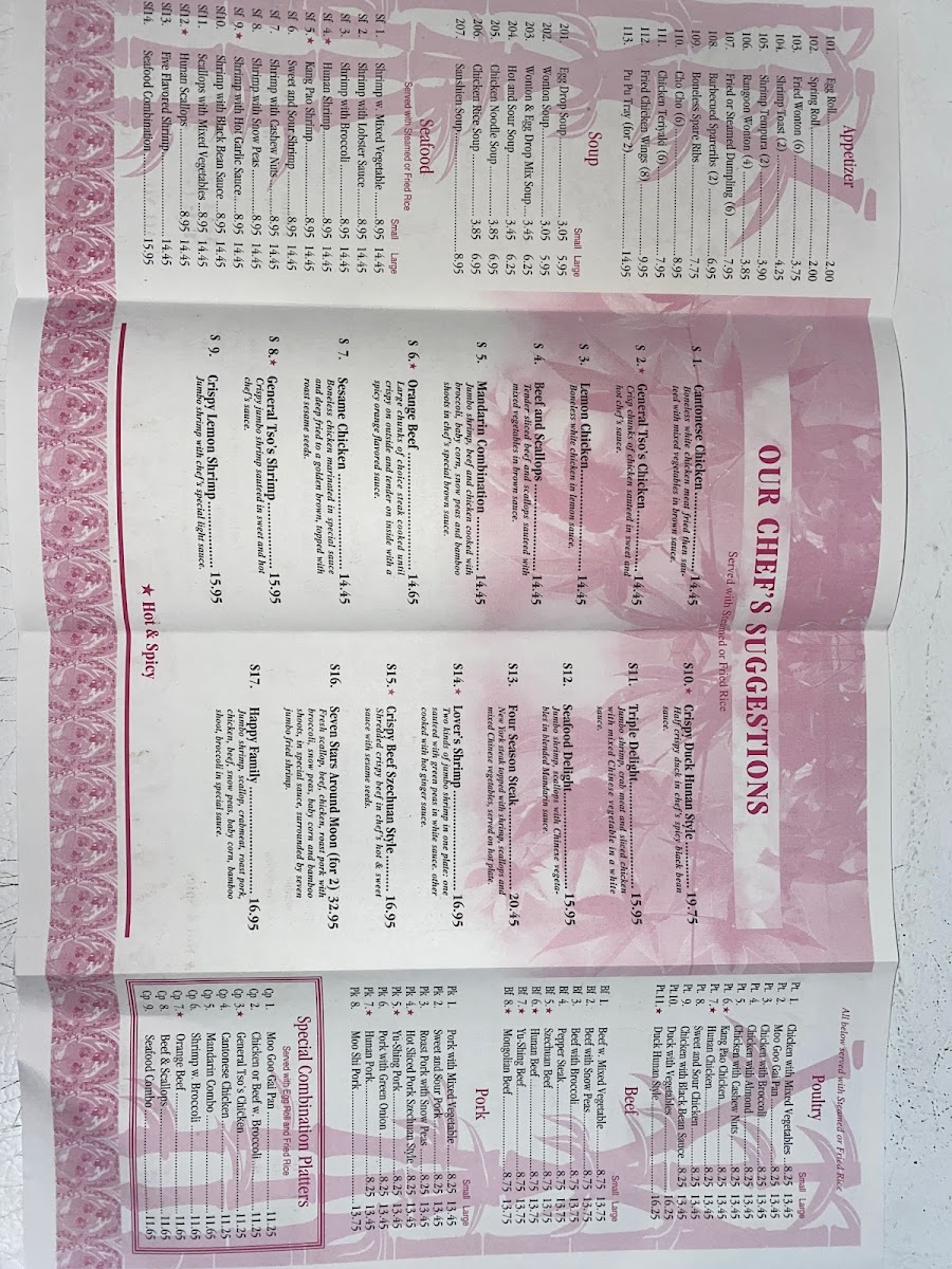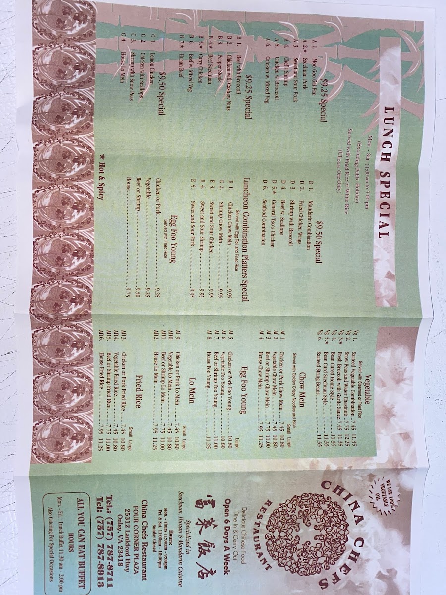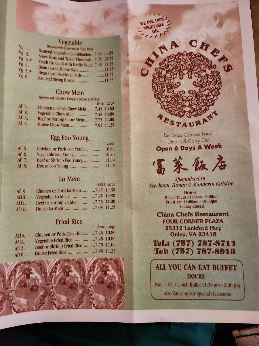 The menu at China Chefs Restaurant offers a straightforward and comforting selection of Chinese dishes and classic bar bites. From crispy appetizers like shrimp tempura and fried wontons to hearty combination platters featuring favorites such as General Tso's Chicken and Mandarin Combo, the menu invites guests to enjoy familiar flavors in a casual setting.